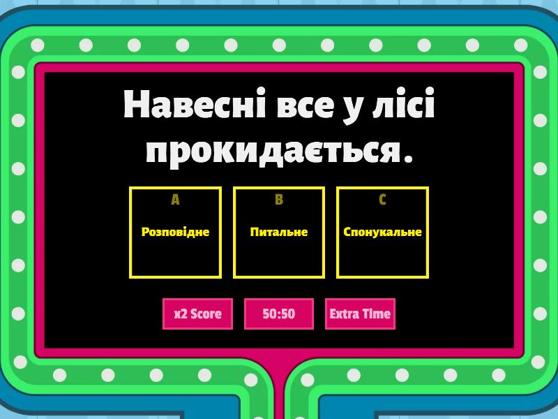 1) Навесні все у лісі прокидається. a) Розповідне b) Питальне c) Спонукальне 2) У садку росте малина. a) Розповідне b) Питальне c) Спонукальне 3) Коли заспівають пташки? a) Розповідне b) Питальне c) Спонукальне 4) Не рви первоцвітів! a) Розповідне b) Питальне c) Спонукальне 5) Сьогодні буде сонячно? a) Розповідне b) Питальне c) Спонукальне 6) Сплять дерева під сніжною ковдрою. a) Розповідне b) Питальне c) Спонукальне 7) Діти, підгодовуйте пташок взимку! a) Розповідне b) Питальне c) Спонукальне 8) Ти уважно слухаєш вчителя? a) Розповідне b) Питальне c) Спонукальне 9) Бережи природу! a) Розповідне речення. b) Питальне речення. c) Спонукальне речення. 10) Тобі сподобалась гра? a) Розповідне речення. b) Питальне речення. c) Спонукальне речення.
