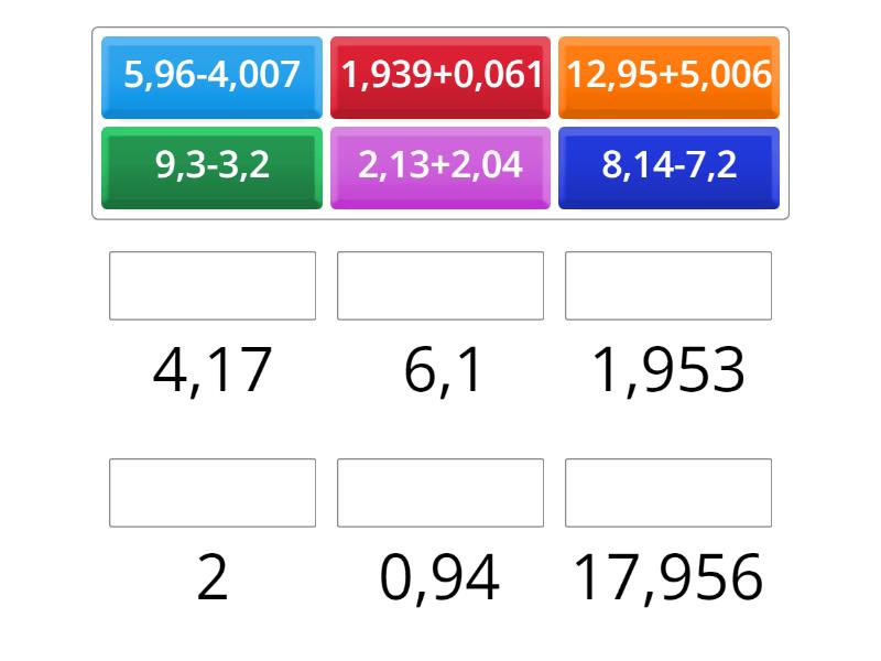 9,3-3,2 - 6,1, 2,13+2,04 - 4,17, 8,14-7,2 - 0,94, 12,95+5,006 - 17,956, 5,96-4,007 - 1,953, 1,939+0,061 - 2,
