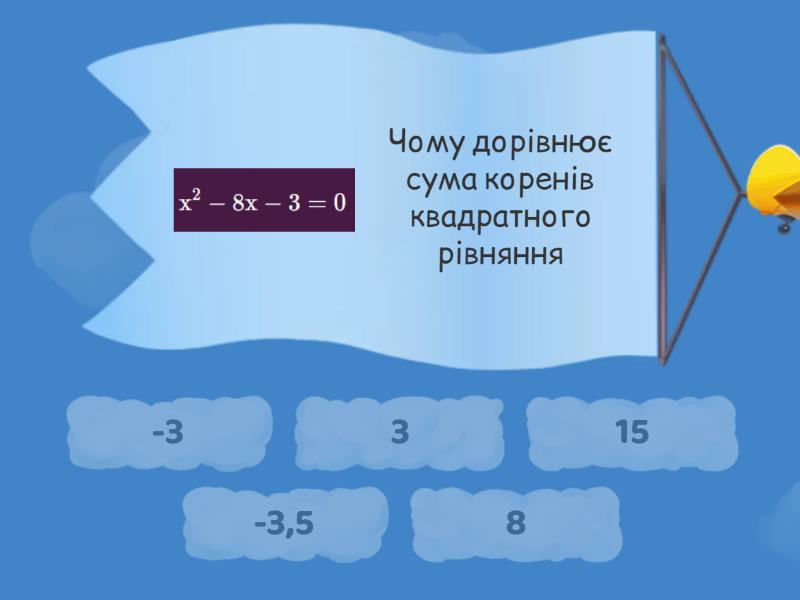 8 - Чому дорівнює сума коренів квадратного рівняння, -3 - Чому дорівнює добуток коренів квадратного рівняння, 3 - Один із коренів квадратного рівняння дорівнює 4. Знайди другий корінь., 15 - Знайди значення m, при якому сума коренів рівняння дорівнює 5., -3,5 - Знайди добуток коренів квадратного рівняння,