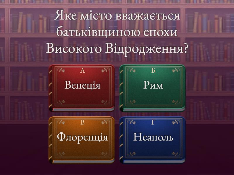 1) Яке місто вважається батьківщиною епохи Високого Відродження? a) Венеція b) Рим c) Флоренція d) Неаполь 2) Хто є автором фрески "Таємна вечеря"? a) Рафаель Санті b) Леонардо да Вінчі c) Мікеланджело Буонарроті d) Пітер Брейгель Старший 3) Який вид мистецтва став одним із найвідоміших досягнень Альбрехта Дюрера? a) Живопис b) Архітектура c) Скульптура d) Гравюра 4) Яка картина Рафаеля Санті вважається вершиною його творчості? a) "Таємна вечеря" b) "Сикстинська мадонна" c) "Мона Ліза" d) "Створення Адама" 5) Хто створив розпис стелі Сикстинської капели? a) Мікеланджело Буонарроті b) Альбрехт Дюрер c) Пітер Брейгель Старший d) Леонардо да Вінчі 6) Який твір Пітера Брейгеля Старшого показує невпевненість у майбутньому і страх перед змінами? a) "Сикстинська мадонна" b) "Афінська школа" c) "Тріумф смерті" d) "Мона Ліза" 7) Що було основною ідеєю гуманізму? a) Відновлення релігійних традицій b) Покращення людської природи через дослідження античної спадщини c) Розвиток техніки і науки d) Зміцнення влади монархів 8) Який твір Леонардо да Вінчі вважається одним із перших портретів, що показує внутрішній світ людини? a) "Мона Ліза" b) "Таємна вечеря" c) "Тріумф смерті" d) "Сикстинська мадонна" 9) Хто був автором скульптури "Мойсей"? a) Рафаель Санті b) Мікеланджело Буонарроті c) Альбрехт Дюрер d) Пітер Брейгель Старший 10) Яка картина Мікеланджело Буонарроті вважається найграндіознішим із його творінь? a) "Мона Ліза" b) "Сикстинська мадонна" c) "Таємна вечеря" d) Розпис стелі Сикстинської капели