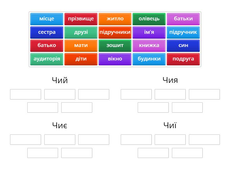 Чий: батько, підручник, олівець, зошит, син, Чия: мати, подруга, книжка, аудиторія, сестра, Чиє: імʼя , прізвище, місце, вікно, житло, Чиї: друзі, батьки, діти, підручники, будинки,