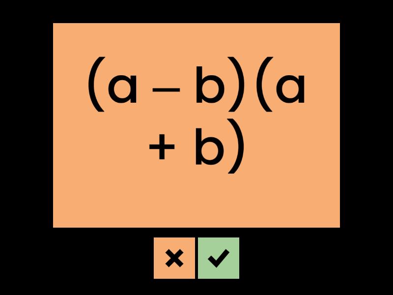 (a + b)2 - a2 + 2ab + b2, a2 + 2ab + b2 - (a + b)2, (a - b)2 - a2 - 2ab + b2, a2 – b2 - (a – b)(a + b), a3 + b3 - (a + b)(a2 – ab + b2), a3 - b3 - (a - b)(a2 + ab + b2), a2 - 2ab + b2 - (a - b)2, (a – b)(a + b) - a2 – b2,