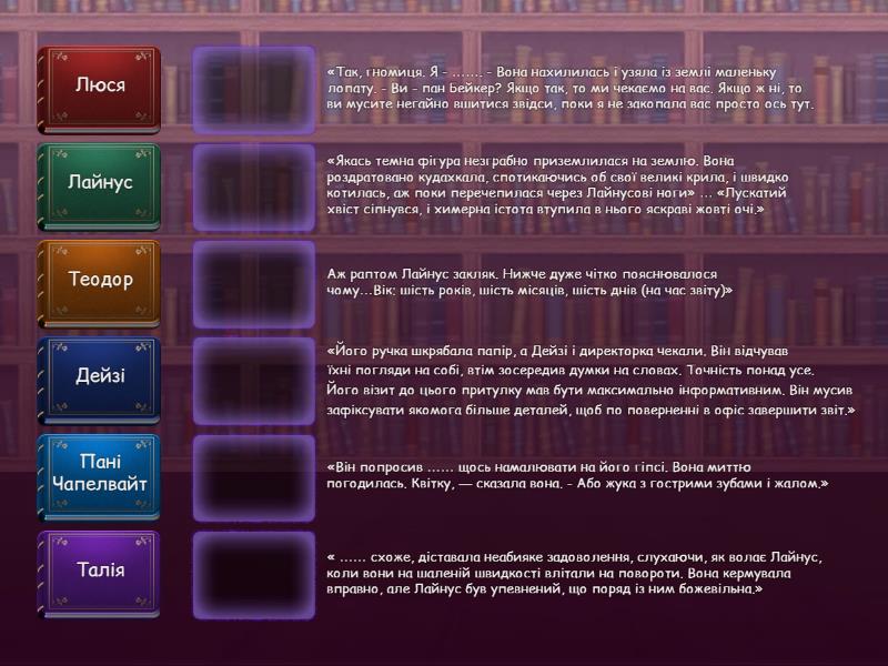 Дейзі - «Він попросив …… щось намалювати на його гіпсі. Вона миттю погодилась. Квітку, — сказала вона. - Або жука з гострими зубами і жалом.», Лайнус - «Його ручка шкрябала папір, а Дейзі і директорка чекали. Він відчував їхні погляди на собі, втім зосередив думки на словах. Точність понад усе. Його візит до цього притулку мав бути максимально інформативним. Він мусив зафіксувати якомога більше деталей, щоб по поверненні в офіс завершити звіт.», Теодор - «Якась темна фігура незграбно приземлилася на землю. Вона роздратовано кудахкала, спотикаючись об свої великі крила, і швидко котилась, аж поки перечепилася через Лайнусові ноги» … «Лускатий хвіст сіпнувся, і химерна істота втупила в нього яскраві жовті очі.», Талія - «Так, гномиця. Я - ……. - Вона нахилилась і узяла із землі маленьку лопату. - Ви - пан Бейкер? Якщо так, то ми чекаємо на вас. Якщо ж ні, то ви мусите негайно вшитися звідси, поки я не закопала вас просто ось тут., Пані Чапелвайт - « …… схоже, діставала неабияке задоволення, слухаючи, як волає Лайнус, коли вони на шаленій швидкості влітали на повороти. Вона кермувала вправно, але Лайнус був упевнений, що поряд із ним божевільна.», Люся - Аж раптом Лайнус закляк. Нижче дуже чітко пояснювалося чому…Вік: шість років, шість місяців, шість днів (на час звіту)»,