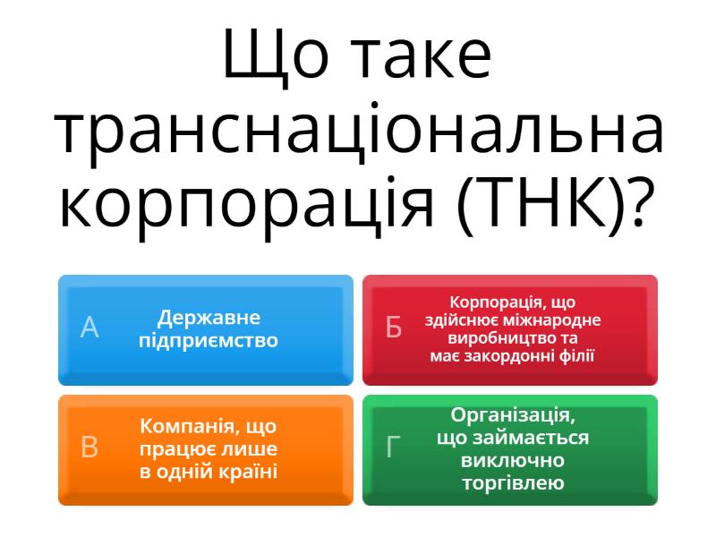 1) Що таке транснаціональна корпорація (ТНК)? a) Державне підприємство b) Корпорація, що здійснює міжнародне виробництво та має закордонні філії c) Компанія, що працює лише в одній країні d) Організація, що займається виключно торгівлею 2) Коли була підписана Генеральна угода про тарифи і торгівлю (ГАТТ)? a) 1990 р b) 1947 р c) 1980 р. d) 1955 р 3) Що спричинила науково-технічна революція (НТР)? a) Погіршення умов праці b) Стагнацію промисловості c) Докорінні зміни в праці людини та вимогах до професійних якостей d) Зниження продуктивності 4) Яка політика була основою «рейганоміки»? a) Посилення державного контролю b) Збільшення соціальних програм c) Обмеження втручання держави в економіку d) Колективізація 5) Який термін описує британський різновид неоконсерватизму за часів Маргарет Тетчер? a) Рейганоміка b) Кейнсіанство c) Соціалізм d) Тетчеризм 6) Що було однією з основних цілей політики М. Тетчер? a) Підвищення податків b) Збільшення державних витрат c) Приватизація державної власності d) Створення монополій 7) Яка модель економіки поєднує свободу ринку з принципом соціального вирівнювання? a) Соціальне ринкове господарство b) Ліберальна економіка c) Капіталістична економіка d) Комуністична економіка 8) Що таке «демократичний соціалізм» у шведській моделі? a) Економіка, заснована виключно на державній власності b) Колективістсько-універсалістська модель розвитку на основі приватної власності та ринку c) Система, що сприяє нерівності доходів d) Повна відмова від ринкових механізмів 9) Яка з наступних характеристик належить до результатів «рейганоміки»? a) Збільшення безробіття b) Зростання особистих доходів американців c) Погіршення соціальних умов d) Зменшення ефективності виробництва 10) Який рік став початком економічного піднесення у Великій Британії завдяки політиці «тетчеризму»? a) 1975 р. b) 1990 р. c) 1983 р. d) 1980 р