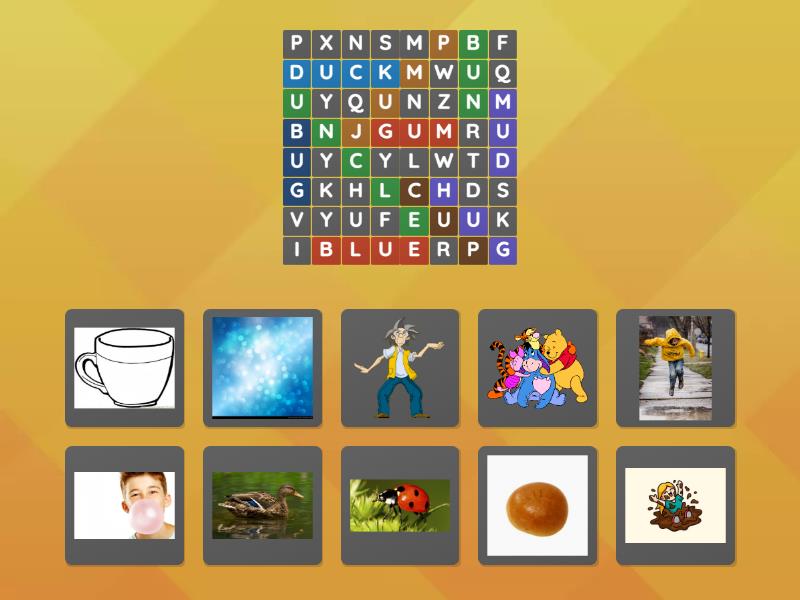 uncle, hug, gum, duck, cup, bug, jump, bun, mud, Blue,