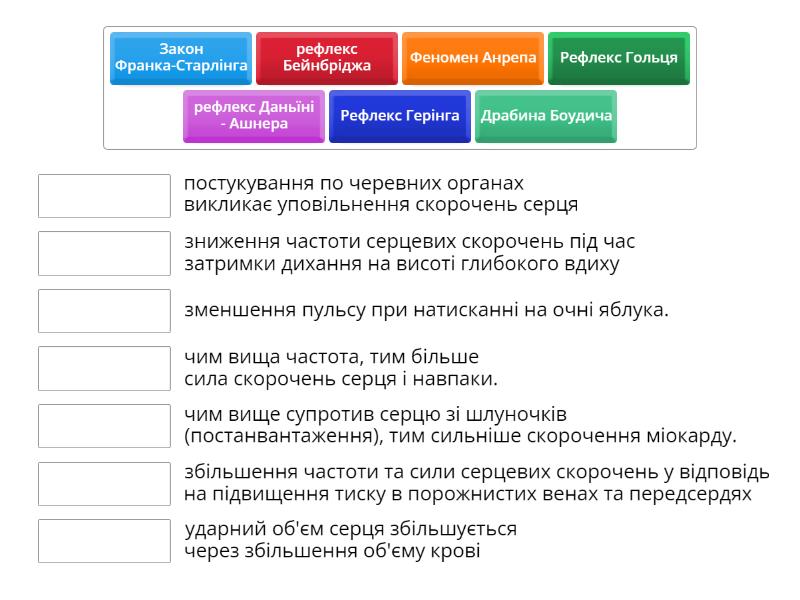 Закон Франка-Старлінга - ударний об'єм серця збільшується через збільшення об'єму крові, рефлекс Даньїні - Ашнера - зменшення пульсу при натисканні на очні яблука., Рефлекс Гольця - постукування по черевних органах викликає уповільнення скорочень серця, рефлекс Бейнбріджа - збільшення частоти та сили серцевих скорочень у відповідь на підвищення тиску в порожнистих венах та передсердях, Рефлекс Герінга - зниження частоти серцевих скорочень під час затримки дихання на висоті глибокого вдиху, Драбина Боудича - чим вища частота, тим більше сила скорочень серця і навпаки., Феномен Анрепа - чим вище супротив серцю зі шлуночків (постанвантаження), тим сильніше скорочення міокарду.,