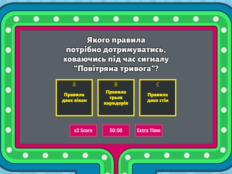 1) Якого правила потрібно дотримуватись, ховаючись під час сигналу "Повітряна тривога"? a) Правила двох вікон b) Правила трьох коридорів c) Правила двох стін 2) Коли незнайомі люди просять вас віддати їм документи, потрібно... a) віддати документи під розписку b) дати в руки подивитися і попросити назад c) за жодних обставин не віддавати документи 3) Під час вуличних боїв та повітряної тривоги особливо небезпечно знаходитися біля ... a) дверей b) вікон c) холодильника d) шафи 4) Яким джерелам інформації потрібно довіряти? a) Інформації від друзів b) Офіційним джерелам інформації c) Інформації із соцмереж 5) Якщо бачиш озброєних людей, військову техніку, масові заворушення, потрібно ... a) покинути це місце та негайно повідомити дорослих b) почати фотографувати c) заховатися і спостерігати 6) Якщо, перебуваючи на вулиці, виявив іграшки, мобільний телефон, інші речі, які тобі не належать, пам'ятай! a) Категорично забороняється педнімати чи переносити ці предмети b) Можна взяти предмети собі, якщо ніхто не бачить c) Можна погратися і залишити предмети на тому ж місці 7) У разі порушення твоїх прав звертайся за телефоном - a) 101 b) 102 c) 103 8) Хто НЕ входить у перелік людей, яким можна довіряти? a) Батьки b) Родичі c) Перехожі d) Друзі e) Вчителі f) Сусіди 9) Коли не можна виходити на вулицю? a) В період дії комендантської години b) В період між сигналами повітряної тривоги c) В період, коли вдома немає батьків 10) Для емоційної стабілізації корисними є ... a) ситна їжа b) ігри з друзями c) розмови з батьками та рідними