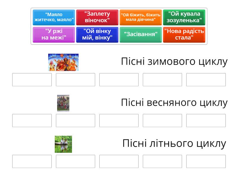 Пісні зимового циклу : "Нова радість стала", "Засівання", Пісні весняного циклу : "Ой кувала зозуленька", Пісні літнього циклу : "У ржі на межі", "Ой біжить, біжить мала дівчина", "Заплету віночок", "Ой вінку мій, вінку", "Маяло житечко, маяло",