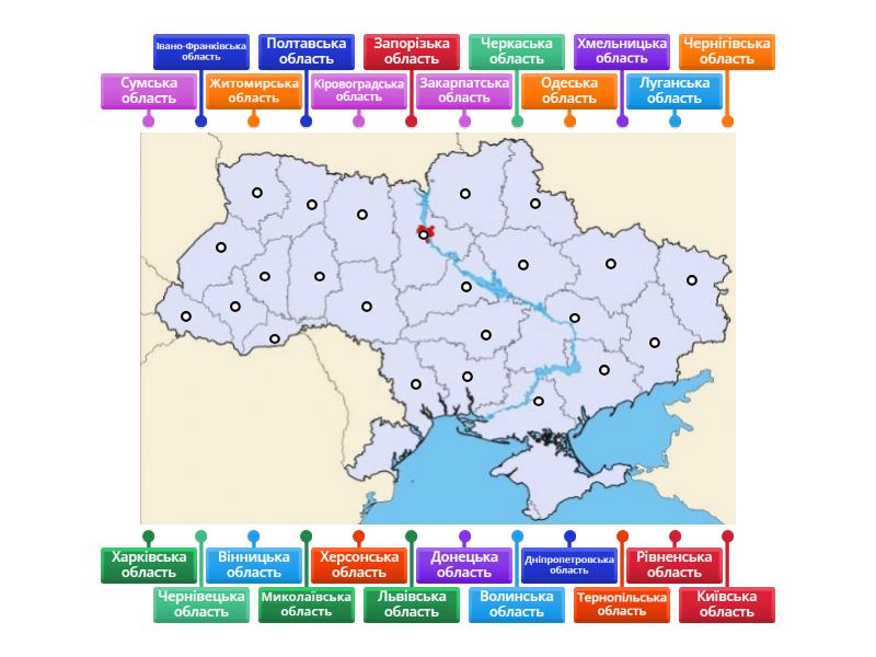 Волинська область, Рівненська область, Житомирська область, Львівська область, Закарпатська область, Івано-Франківська область, Чернівецька область, Тернопільська область, Хмельницька область, Вінницька область, Київська область, Чернігівська область, Харківська область, Сумська область, Полтавська область, Черкаська область, Херсонська область, Донецька область, Луганська область, Запорізька область, Одеська область, Миколаївська область, Кіровоградська область, Дніпропетровська область.