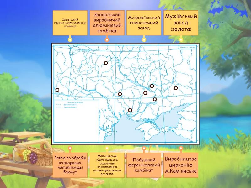 Миколаївський глиноземний завод, Запорізький виробничий алюмінієвий комбінат, Іршанський гірничо-збагачувальний комбінат, Побузький феронікелевий комбінат, Мужіївський завод (золота), Виробництво цирконію м.Кам'янське, Малишівське (Самотканське) родовище комплексних титано-цирконових розсипів, Завод по обробці кольорових металів(мідь) Бахмут.