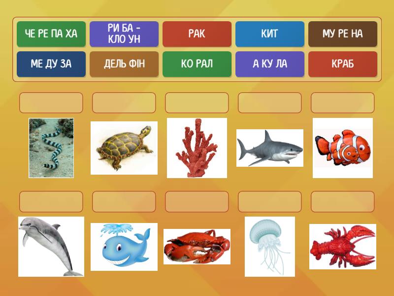 А КУ ЛА, ДЕЛЬ ФІН, МЕ ДУ ЗА, ЧЕ РЕ ПА ХА, КИТ, КО РАЛ, КРАБ, РАК, МУ РЕ НА, РИ БА - КЛО УН,