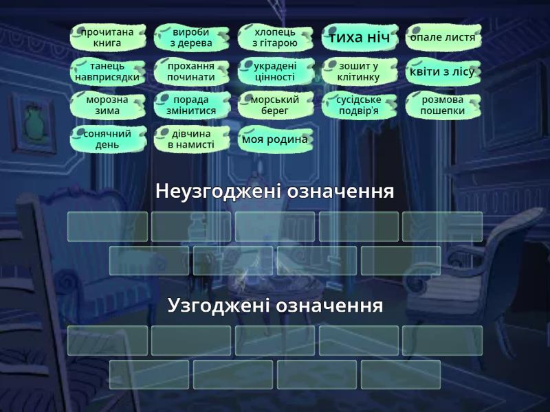 Неузгоджені означення: прохання починати, танець навприсядки, порада змінитися, розмова пошепки, вироби з дерева, зошит у клітинку, хлопець з гітарою, дівчина в намисті, квіти з лісу, Узгоджені означення: сонячний день, сусідське подвір'я, морський берег, моя родина, опале листя, прочитана книга, украдені цінності, тиха ніч, морозна зима,