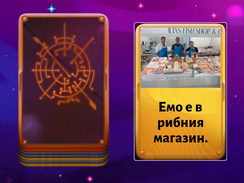 Рибата е в тигана., Райна си купи риза., Марио рита топката., Боксьорите са на ринга., Гери е с рижава коса., Емо е в рибния магазин., В реката има риби., Ради рисува рисунка..