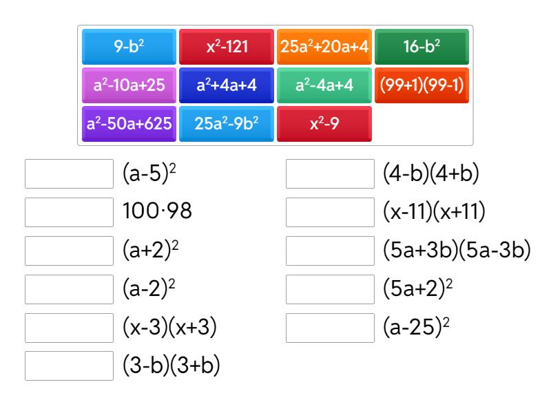 (99+1)(99-1) - 100∙98, 25a2-9b2 - (5a+3b)(5a-3b), 25a2+20a+4 - (5a+2)2, a2+4a+4 - (a+2)2, a2-4a+4 - (a-2)2, a2-10a+25 - (a-5)2, a2-50a+625 - (a-25)2, 16-b2 - (4-b)(4+b), 9-b2 - (3-b)(3+b), x2-9 - (x-3)(x+3), x2-121 - (x-11)(x+11),