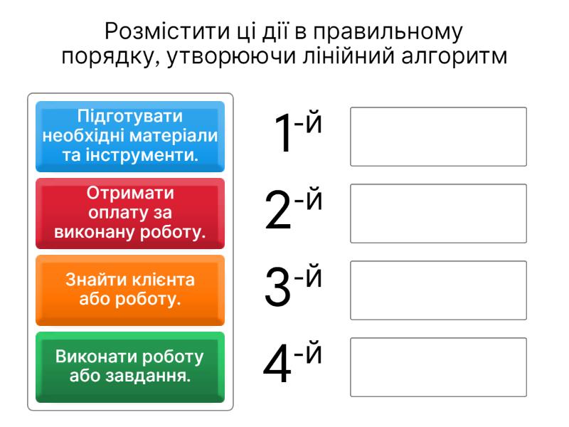 : Знайти клієнта або роботу., Підготувати необхідні матеріали та інструменти., Виконати роботу або завдання., Отримати оплату за виконану роботу.,