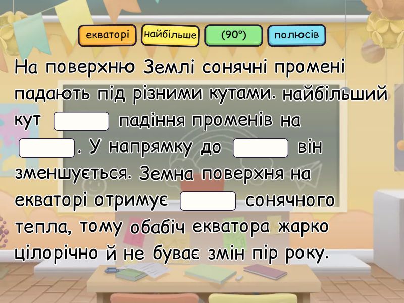 На поверхню Землі сонячні промені падають під різними кутами. найбільший кут ____ падіння променів на ____. У напрямку до ____ він зменшується. Земна поверхня на екваторі отримує ____ сонячного тепла, тому обабіч екватора жарко цілорічно й не буває змін пір року. Посередником між променевою енергією ____ і життям на ____ є ____, що використовують під час ____ енергію Сонця для перетворення ____ речовин на ____ речовину