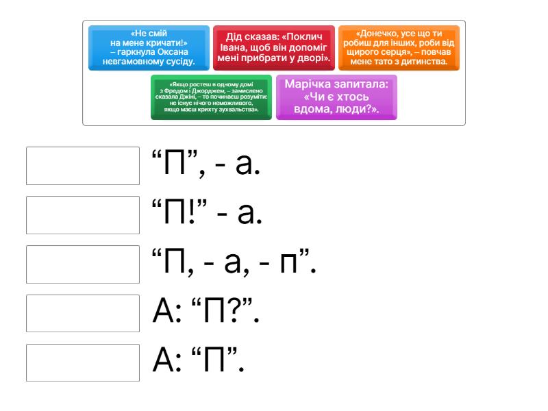 Дід сказав: «Поклич Івана, щоб він допоміг мені прибрати у дворі». - А: “П”., «Якщо ростеш в одному домі з Фредом і Джорджем, – замислено сказала Джіні, – то починаєш розуміти: не існує нічого неможливого, якщо маєш крихту зухвальства». - “П, - а, - п”., «Донечко, усе що ти робиш для інших, роби від щирого серця», – повчав мене тато з дитинства. - “П”, - а., «Не смій на мене кричати!» – гаркнула Оксана невгамовному сусіду. - “П!” - а., Марічка запитала: «Чи є хтось вдома, люди?». - А: “П?”.,