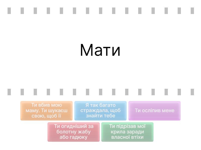 Я так багато страждала, щоб знайти тебе - Мати,  Ти огидніший за болотну жабу або гадюку - Вартові,   Ти вбив мою маму. Ти шукаєш свою, щоб її - Білка,  Ти підрізав мої крила заради власної втіхи - Коноплянка, Ти осліпив мене - Кріт,