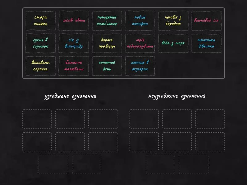 узгоджене означення : маленька дівчинка, вишневий сік, лісові квіти, вишивана сорочка, потужний комп'ютер, новий телефон, стара книжка, сонячний день, неузгоджене означення: сік із винограду, вода з моря, дорога праворуч, сукня в горошок, хлопець в окулярах, чоловік з бородою, бажання малювати, мрія подорожувати,