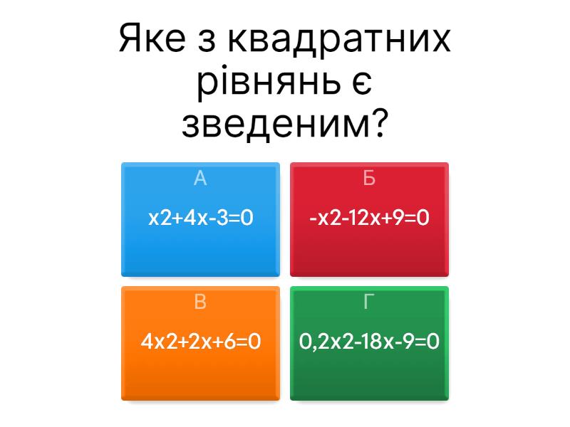 1) Яке з квадратних рівнянь є зведеним? a) х2+4х-3=0 b) -х2-12х+9=0 c) 4х2+2х+6=0 d) 0,2х2-18х-9=0 2) Чому дорівнює сума коренів квадратного рівняння х2+12х+20=0? a) 20 b) 12 c) -12 d) -20 3) Чому дорівнює добуток коренів квадратного рівняння х2-7х+12=0 a) 7 b) -7 c) 12 d) -12 4) х2+11х+q=0; x1=-1; x2 - ? ; q - ? a) 10; -10 b) -10; 10 c) 11; -1 d) 12; -12 5) Рівняння х2+кх+р=0 має корені 2 і 4. Знайдіть к і р. a) k=6; p=8 b) k=8; p=6 c) k=6; p= -8 d) k=-6; p=8 6) 2x2+7x+5 Знайдіть чому дорівнює дискримінант. a) 3 b) 9 c) 69 d) 49 7) (Розв'язати у зошиті) Розв’язати рівняння, використовуючи теорему Вієта: x2+10x-24 = 0 a) 4 b) 6 c) -4 d) -6 e) 2 f) 12