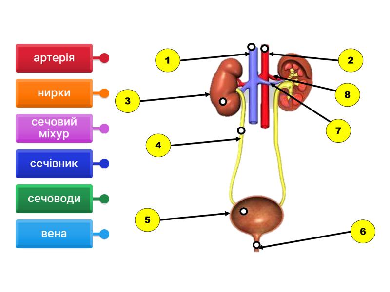 вена , артерія, нирки, сечоводи, сечовий міхур, сечівник.