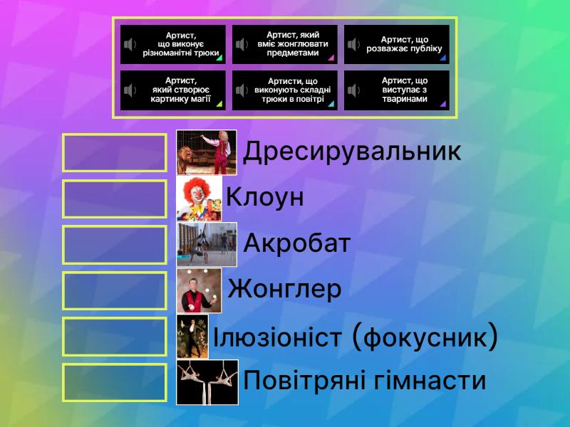Артист, що виконує різноманітні трюки - Акробат, Артист, який вміє жонглювати предметами - Жонглер, Артист, який створює картинку магії - Ілюзіоніст (фокусник), Артисти, що виконують складні трюки в повітрі - Повітряні гімнасти, Артист, що розважає публіку - Клоун, Артист, що виступає з тваринами - Дресирувальник,