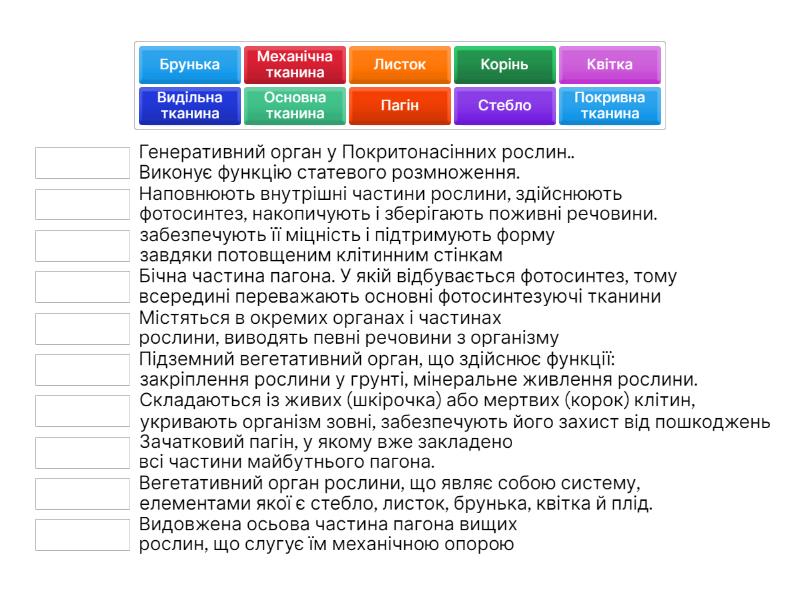 Основна тканина - Наповнюють внутрішні частини рослини, здійснюють фотосинтез, накопичують і зберігають поживні речовини., Механічна тканина - забезпечують її міцність і підтримують форму завдяки потовщеним клітинним стінкам, Видільна тканина - Містяться в окремих органах і частинах рослини, виводять певні речовини з організму, Покривна тканина - Складаються із живих (шкірочка) або мертвих (корок) клітин, укривають організм зовні, забезпечують його захист від пошкоджень, Корінь - Підземний вегетативний орган, що здійснює функції: закріплення рослини у грунті, мінеральне живлення рослини., Брунька - Зачатковий пагін, у якому вже закладено всі частини майбутнього пагона., Стебло - Видовжена осьова частина пагона вищих рослин, що слугує їм механічною опорою, Пагін - Вегетативний орган рослини, що являє собою систему, елементами якої є стебло, листок, брунька, квітка й плід., Квітка - Генеративний орган у Покритонасінних рослин.. Виконує функцію статевого розмноження., Листок - Бічна частина пагона. У якій відбувається фотосинтез, тому всередині переважають основні фотосинтезуючі тканини,