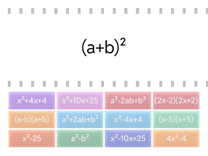 a²+2ab+b² - (a+b)², a²-2ab+b² - (a-b)², (a-b)(a+b) - a²-b², a²-b² - (a-b)(a+b), x²+10x+25 - (x+5)², x²-10x+25 - (x-5)², (x-5)(x+5) - x²-25, x²-25 - (x-5)(x+5), x²+4x+4 - (x+2)², x²-4x+4 - (x-2)², (2x-2)(2x+2) - 4x²-4, 4x²-4 - (2x-2)(2x+2),