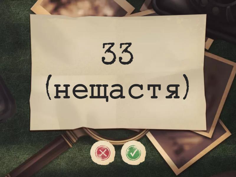 3 (день), 11 (друг), 2 (шеф), 5 (крок), 7 (душа), 28 (тиждень), 3 (горішок), 12 (рік), 33 (нещастя), 2 з половиною (чоловік), 1,5 (шпигун), 9 (життя), 3 (король), 22 (миля),