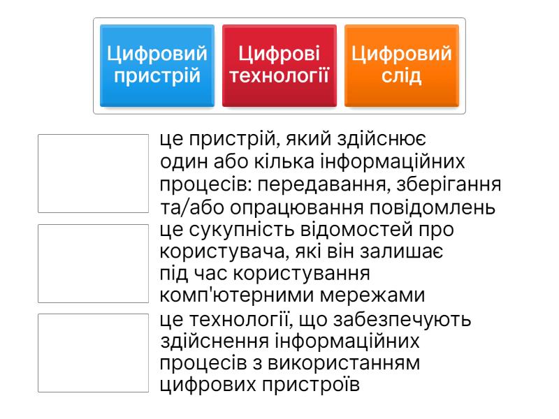 Цифровий слід - це сукупність відомостей про користувача, які він залишає під час користування комп'ютерними мережами, Цифровий пристрій - це пристрій, який здійснює один або кілька інформаційних процесів: передавання, зберігання та/або опрацювання повідомлень, Цифрові технології - це технології, що забезпечують здійснення інформаційних процесів з використанням цифрових пристроїв,