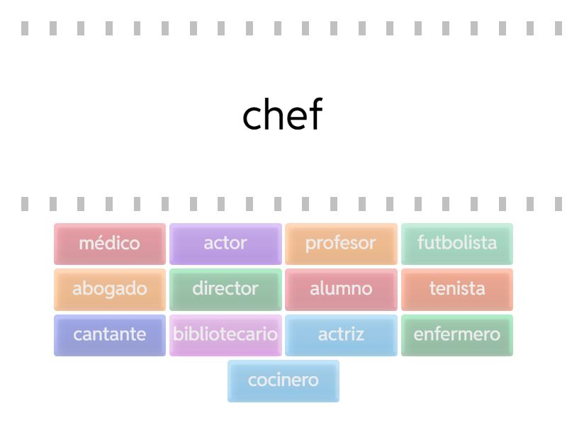 cocinero - chef, médico - doctor, profesor - teacher, enfermero - nurse, bibliotecario - librarian, cantante - singer, futbolista - soccer player, tenista - tennis player, actor - actor (masculine), actriz - actress, alumno - student, abogado - lawyer, director - director,