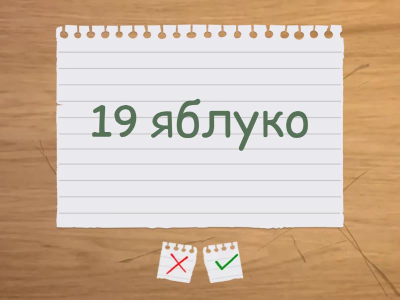5 липа - Пʼять лип., 15 книга - П'ятнадцять книг., 60 шафа - Шістдесят шаф., 16 каченя - Шістнадцять каченят., 50 журавель - Пʼятдесят журавлів., 19 яблуко - Девʼятнадцять яблук.,