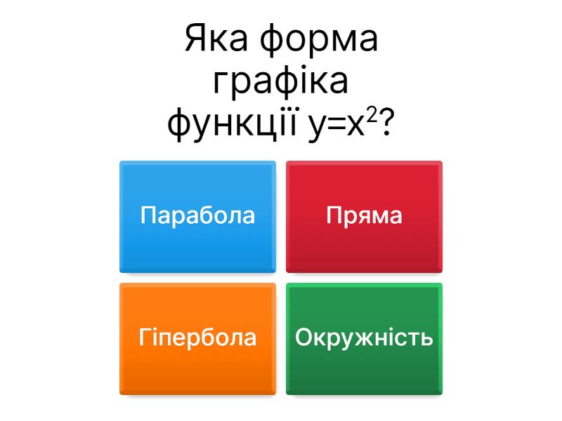 1) Яка форма графіка функції y=x2? a) Парабола b) Пряма c) Гіпербола d) Окружність 2) Як розташований графік функції y=x2? a) Відкрита вгору b) Відкрита вниз c) Повернута на 90º d) Має вигляд прямої 3) Яке рівняння осі симетрії функції y=x2? a) x=0 b) y=0 c) x=1 d) y=1 4) Яка область визначення функції y=x2? a) (-∞; +∞) b) (-∞; 0] c) [0; +∞) d) [-1; 1] 5) Яка область значень функції y=x2? a) [0;+∞) b) [-1; 1] c) (-∞; 0] d) (-∞;+∞) 6) Яка координата вершини параболи y=x2? a) (1;1) b) (0;0) c) (-1;1) d) (0;-1) 7) Як змінюється значення функції y=x2 на проміжку (-∞;0]? a) Зростає b) Не змінюється c) Неможливо визначити d) Спадає 8) Як змінюється значення функції y=x2 на проміжку [0;+∞)? a) Не змінюється b) Зростає c) Спадає d) Неможливо визначити 9) Які точки належать графіку функції y=x2? a) (2;3) b) (-1;-1) c) (2;4) d) (3;6) 10) Яке значення функція y=x2 приймає при x=-3 a) 3 b) 6 c) -9 d) 9