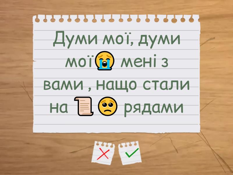 Садок🍒 коло 🏠, хрущі над вишнями 🎵 - вишневий; хати; гудуть, Мені однаково чи буду я жить в 🇺🇦 чи ні, чи хто 💡 чи забуде мене в ❄️ на чужині - Україні; згадає; снігу, Ой 3⃣ шляхи широкії докупи зійшлися, на чужині з 🇺🇦👬 розійшлися - три; брати, Як ⚰, то поховайте мене на 🪦, серед 🌾 широкого, на Вкраїні милій - умру; могилі; степу, 😭 та стогне 🌊 широкий, сердитий 💨 завива - реве; Дніпр; вітер, 💫 моя вечірняя, зійди над ⛰ 🗣 тихесенько в неволі з тобою - Зоре; горою; поговорим, Мені 1⃣3⃣ ⏳Я пас 🐑 за селом - тринадцяти минало; ягнята, Думи мої, думи мої😭 мені з вами , нащо стали на 📜🥺 рядами - лихо; папері; сумними, Тече 💦 в синє 🌊 та не витікає, шука👨🏻 свою долю а долі ❌ - вода; море; козак; немає,