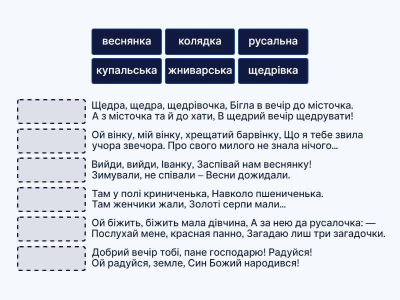 веснянка - Вийди, вийди, Іванку, Заспівай нам веснянку! Зимували, не співали – Весни дожидали., колядка - Добрий вечір тобі, пане господарю! Радуйся! Ой радуйся, земле, Син Божий народився!, щедрівка - Щедра, щедра, щедрівочка, Бігла в вечір до місточка. А з місточка та й до хати, В щедрий вечір щедрувати!, русальна - Ой біжить, біжить мала дівчина, А за нею да русалочка: — Послухай мене, красная панно, Загадаю лиш три загадочки., купальська - Ой вінку, мій вінку, хрещатий барвінку, Що я тебе звила учора звечора. Про свого милого не знала нічого..., жниварська - Там у полі криниченька, Навколо пшениченька. Там женчики жали, Золоті серпи мали...,