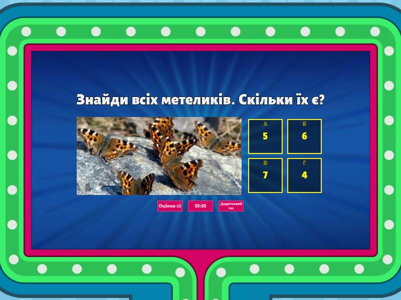 1) Знайди всіх метеликів. Скільки їх є? a) 5 b) 6 c) 7 d) 4 2) Що пропущено? «Сонце, хмарка, місяць, сонце,…, місяць» a) хмарка b) дерево