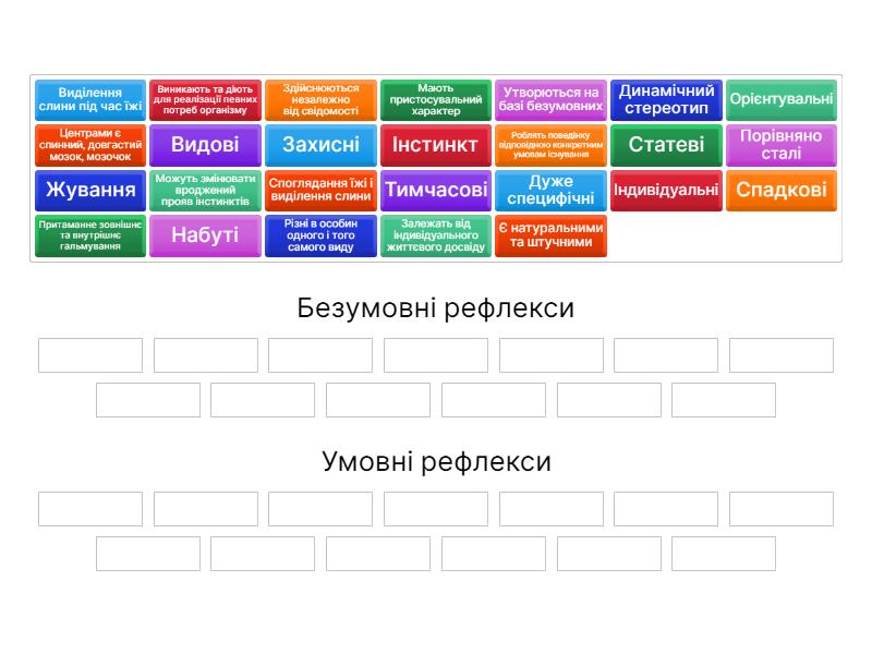 Безумовні рефлекси: Видові, Спадкові, Захисні, Орієнтувальні, Статеві, Жування, Виділення слини під час їжі, Виникають та діють для реалізації певних потреб організму, Порівняно сталі, Дуже специфічні, Центрами є спинний, довгастий мозок, мозочок, Здійснюються незалежно від свідомості, Інстинкт, Умовні рефлекси: Набуті, Індивідуальні, Роблять поведінку відповідною конкретним умовам існування, Різні в особин одного і того самого виду, Утворються на базі безумовних, Споглядання їжі і виділення слини, Тимчасові, Можуть змінювати вроджений прояв інстинктів, Динамічний стереотип, Мають пристосувальний характер, Залежать від індивідуального життєвого досвіду, Є натуральними та штучними, Притаманне зовнішнє та внутрішнє гальмування,