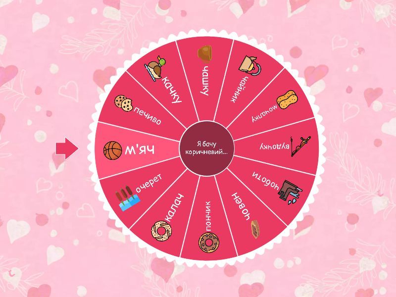 1) печиво 2) качку 3) чашку 4) чайник 5) мочалку 6) вудочку 7) чоботи 8) човен 9) пончик 10) калач 11) очерет 12) м'яч