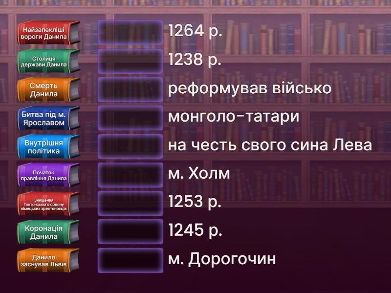 Данило заснував Львів - на честь свого сина Лева, Столиця держави Данила  - м. Холм, Початок правління Данила - 1238 р., Битва під м. Ярославом - 1245 р., Знищення Тевтонського ордену німецьких хрестоносців - м. Дорогочин, Коронація Данила - 1253 р., Смерть Данила - 1264 р., Найзапекліші вороги Данила - монголо-татари, Внутрішня політика - реформував військо,