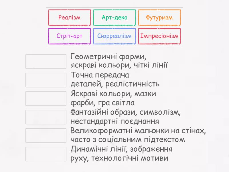 Реалізм - Точна передача деталей, реалістичність, Імпресіонізм - Яскраві кольори, мазки фарби, гра світла, Сюрреалізм - Фантазійні образи, символізм, нестандартні поєднання, Футуризм - Динамічні лінії, зображення руху, технологічні мотиви, Арт-деко - Геометричні форми, яскраві кольори, чіткі лінії, Стріт-арт - Великоформатні малюнки на стінах, часто з соціальним підтекстом,
