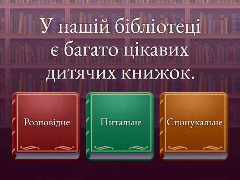 1) У нашій бібліотеці є багато цікавих дитячих книжок. a) Розповідне b) Питальне c) Спонукальне 2) Я люблю читати казки про тварин. a) Розповідне b) Питальне c) Спонукальне 3) Яку улюблену дитячу книжку ти прочитав останнім часом? a) Розповідне b) Питальне c) Спонукальне 4) Хто написав цю цікаву історію? a) Розповідне b) Питальне c) Спонукальне 5) Читайте більше дитячих книжок! a) Розповідне b) Питальне c) Спонукальне