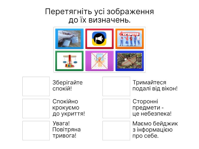 Увага! Повітряна тривога!, Зберігайте спокій!, Тримайтеся подалі від вікон!, Маємо бейджик з інформацією про себе., Спокійно крокуємо до укриття!, Сторонні предмети - це небезпека!,