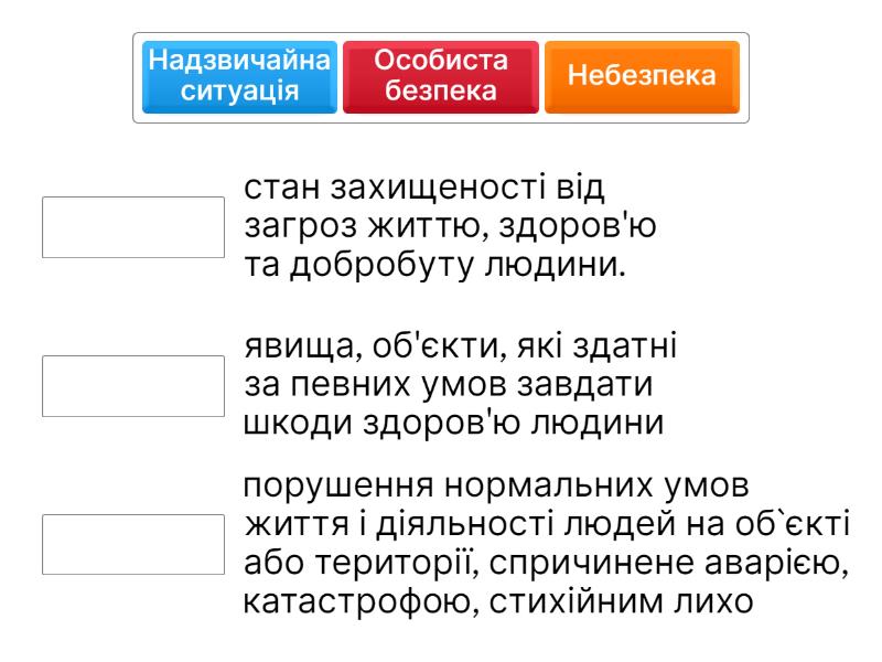 Небезпека - явища, об'єкти, які здатні за певних умов завдати шкоди здоров'ю людини, Надзвичайна ситуація - порушення нормальних умов життя і діяльності людей на об`єкті або території, спричинене аварією, катастрофою, стихійним лихо, Особиста безпека - стан захищеності від загроз життю, здоров'ю та добробуту людини.,