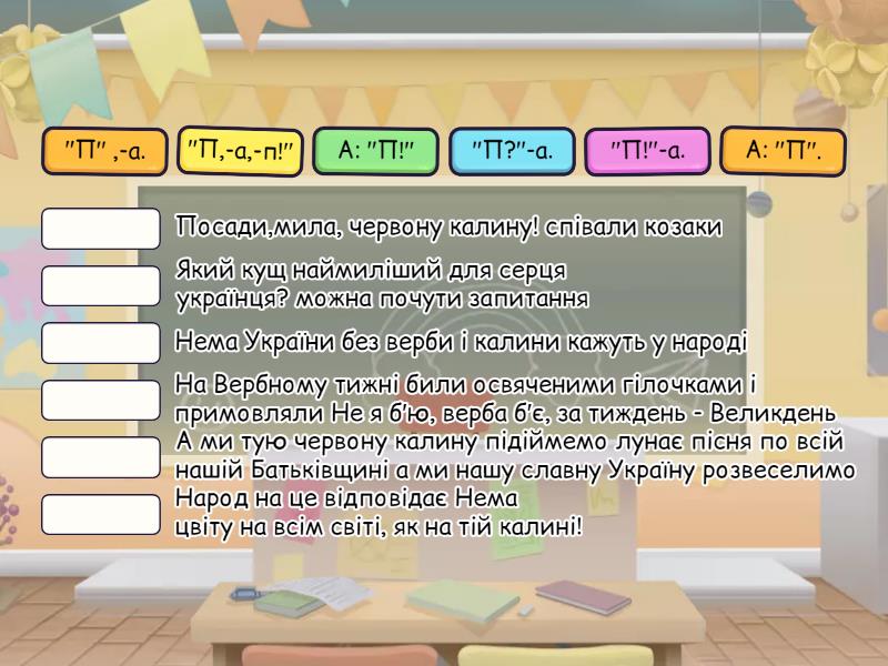 "П?"-а.  - Який кущ наймиліший для серця українця? можна почути запитання, "П!"-а.  - Посади,мила, червону калину! співали козаки, А: "П!" - Народ на це відповідає Нема цвіту на всім світі, як на тій калині!, "П,-а,-п!" - А ми тую червону калину підіймемо лунає пісня по всій нашій Батьківщині а ми нашу славну Україну розвеселимо, "П" ,-а. - Нема України без верби і калини кажуть у народі, А: "П".  - На Вербному тижні били освяченими гілочками і примовляли Не я б'ю, верба б'є, за тиждень - Великдень,