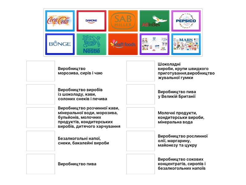 Виробництво рослинної олії, маргарину, майонезу та цукру, Виробництво пива, Виробництво сокових концентратів, сиропів і безалкогольних напоїв, Виробництво виробів із шоколаду, кави, солоних снеків і печива, Виробництво пива у Великій Британії, Виробництво морозива, сирів і чаю, Виробництво розчинної кави, мінеральної води, морозива, бульйонів, молочних продуктів, кондитерських виробів, дитячого харчування, Шоколадні вироби, крупи швидкого приготування,виробництво жувальної гумки, Безалкогольні напої, снеки, бакалейні вироби, Молочні продукти, кондитерськи вироби, мінеральна вода,