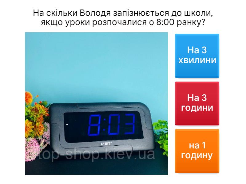 1) На скільки Володя запізнюється до школи, якщо уроки розпочалися о 8:00 ранку? a) На 3 хвилини b) На 3 години c) на 1 годину 2) Через скільки розпочнеться бабусин серіал, якщо початок о 19.00 a) 26 хв b) 60 хв або 1 год c) 30 хв 3) Через скільки продзвенить будильник, який завели на 8:00 ранку? a) 3 год b) 2 год 50 хв c) 4 год 4) Через скільки настане північ? a) 20 хв b) 40 хв c) 30 хв 5) На годиннику - час початку уроку. О котрій годині розпочнеться перерва, якщо урок триває 40 хвилин? a) 10 год 40 хв b) 10 год 50 хв c) 11 год 6) Початок вистави - об 11. 00. Скільки часу до початку вистави? a) 3 год b) 4 хв c) 2 хв d) 2 год 30 хв