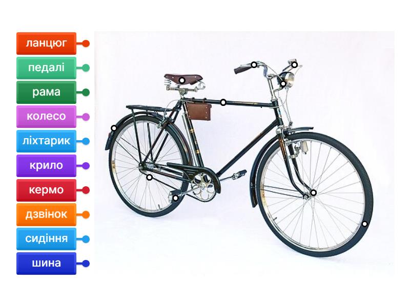 сидіння, кермо, дзвінок, рама, колесо, шина, педалі, ланцюг, крило, ліхтарик.
