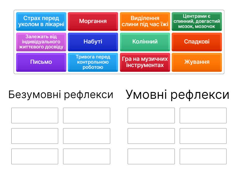 Безумовні рефлекси: Спадкові, Колінний, Моргання, Жування, Виділення слини під час їжі, Центрами є спинний, довгастий мозок, мозочок, Умовні рефлекси: Набуті, Письмо, Тривога перед контрольною роботою , Гра на музичних інструментах , Страх перед уколом в лікарні , Залежать від індивідуального життєвого досвіду,