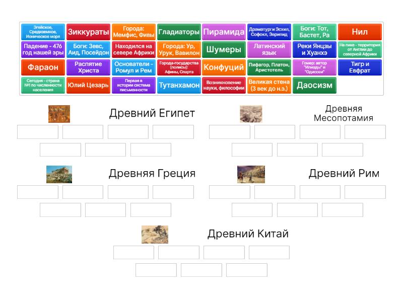 Древний Египет : Фараон , Пирамида , Нил, Города: Мемфис, Фивы, Тутанхамон , Боги: Тот, Бастет, Ра, Находился на севере Африки, Древняя Месопотамия : Тигр и Евфрат , Зиккураты, Города: Ур, Урук, Вавилон, Первая в истории система письменности , Шумеры, Древняя Греция : Возникновение науки, философии, Пифагор, Платон, Аристотель , Города-государства (полисы): Афины, Спарта , Боги: Зевс, Аид, Посейдон, Эгейское, Средиземное, Ионическое моря, Гомер: автор "Илиады" и "Одиссеи", Драматурги Эсхил, Софокл, Эврипид, Древний Рим: Основатели - Ромул и Рем, На пике - территория от Англии до северной Африки, Юлий Цезарь, Латинский язык , Распятие Христа , Падение - 476 год нашей эры, Гладиаторы , Древний Китай: Великая стена (3 век до н.э.), Конфуций , Даосизм , Реки Янцзы и Хуанхэ, Сегодня - страна №1 по численности населения,