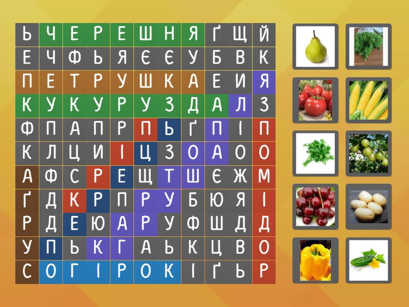 кукурузда, картопля, помідор, огірок, аґрус, перець, петрушка, черешня, груша, кріп,